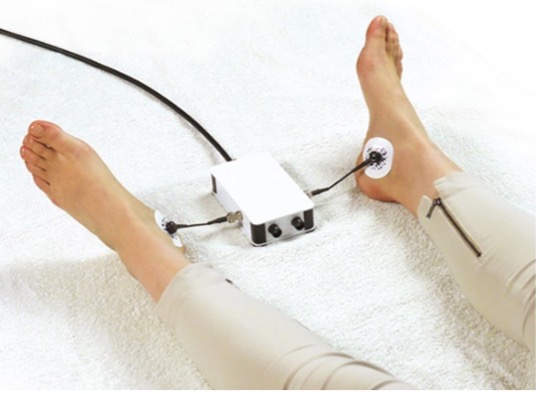 Über zwei Elektroden an den Füßen wird der Körper mit dem Global Diagnostics Gerät verbunden.